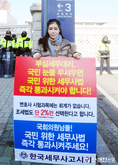 (조세금융신문=김용진 기자) 곽장미 한국세무사고시회 회장이 19일 오전 국회 정문 앞에서 기장 대행과 성실 확인 업무 허용 하지 않는 세무사법을 즉각 의결하라는 1인시위를 하고있다. [조세금융신문(tfmedia.co.kr), 무단전재 및 재배포 금지]