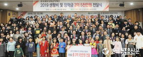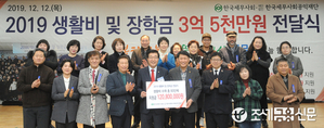 (조세금융신문=김용진 기자) 원경희 한국세무사회 회장 등 한국세무사회 공익재단 관계자들이 12일 오후 한국세무사회관에서 열린 2019년 생활비 및 장학금 전달식에서 참석자들과 기념 촬영을 하고 있다. [조세금융신문(tfmedia.co.kr), 무단전재 및 재배포 금지]
