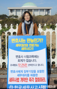 (조세금융신문=김용진 기자) 정혜란 (한국세무사고시회 회원) 세무사가 22일 오전 국회 정문 앞에서 변호사에게 장부 기장을 포함한 세무대리를 허용한 세무사법 개악안 철회를 촉구하는 1인시위를 하고 있다.