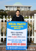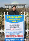 (조세금융신문=김용진 기자) 최영환 한국세무사고시회 조직 상임이사가 26일 오후 국회 정문 앞에서 변호사에게 장부 기장을 포함한 세무대리를 허용한 세무사법 개악안 철회를 촉구하는 1인시위를 하고 있다.