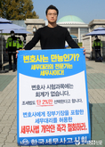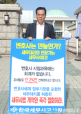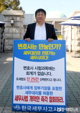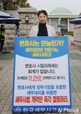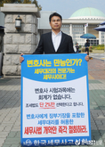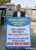 (조세금융신문=김용진 기자)조현우 세무사(한국세무사고시회 회원)가 21일 오후 국회 정문 앞에서 변호사에게 장부 기장을 포함한 세무대리를 허용한 세무사법 개악안 철회를 주장하며 1인 시위를 하고 있다.
