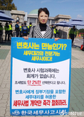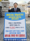 (조세금융신문=김용진 기자)이금주 인천지방세무사회 회장이 14일 오후 국회 정문 앞에서 변호사에게 장부 기장을 포함한 세무대리를 허용한 세무사법 개악안 철회 하라는1인 시위를 하고 있다.
