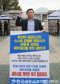 (조세금융신문=김용진 기자)김동균 한국세무사고시회 회원이 20일 오후 국회 정문 앞에서 변호사에게 장부 기장을 포함한 세무대리를 허용한 세무사법 개악안 철회 하라는1인 시위를 하고 있다.