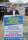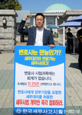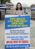 (조세금융신문=김용진 기자)권유진 한국세무사고시회 회원이 6일 오후 국회 정문 앞에서 변호사에게 장부 기장을 포함한 세무대리를 허용한 세무사법 개악안 철회 하라는 1인 시위를 하고 있다.