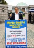 (조세금융신문=김용진 기자)이창식 한국세무사고시회 총무 부회장이 16일 오전 국회 정문 앞에서 변호사에게 장부 기장을 포함한 세무대리를 허용한 세무사법 개악안 철회 하라는 1인 시위를 하고 있다.