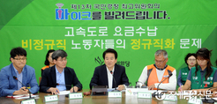 (조세금융신문=김용진 기자)정동영 민주평화당 대표가 21일 오전 국회에서 열린 국민경청 최고위원회에서 고속도로 요금수납 비정규직 노동자들의 정규직화 관련 모두 발언을 하고 있다.