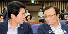 (조세금융신문=김용진 기자)이해찬 더불어민주당 대표와 이인영 원내대표가 21일 오후 국회에서 열린 의원총회에서 대화를 하고 있다.