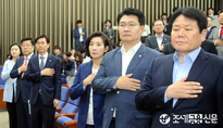 (조세금융신문=김용진 기자)나경원 자유한국당 원내대표와 의원들이 18일 오전 국회에서 열린 정책의원총회에서 국민의례를 하고 있다.