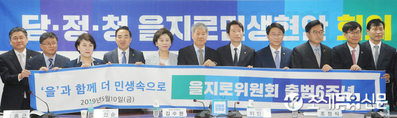 (조세금융신문=김용진 기자) 이인영 더불어민주당 원내대표가 10일 오전 국회 의원회관에서 열린 당정청 을지로 민생현안회의에서 참석자들과 을지로위원회 출범 6주년 현수막을 들고 기념촬영하고 있다.