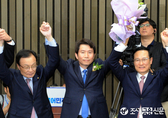 (조세금융신문=김용진 기자)이인영 더불어민주당 새로운 원내대표로 선출된 의원이 8일 오후 국회에서 열린 더불어민주당 새 원내대표 선출을 위한 의원총회에서 당 지도부와 손을 맞잡고 있다. (왼쪽부터) 이해찬 더불어민주당 대표, 이인영 신임 원내대표, 홍영표 원내대표