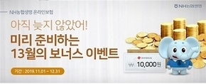 (조세금융신문=방영석 기자)농협생명이11월1일부터12월31일까지 자사 온라인보험을 가입한 고객에게 모바일 신세계 상품권과NH포인트를 증정하는 이벤트를 실시한다고 7일 밝혔다. ‘NH온라인연금저축보험(무배당)’에 월보험료5만원 이상 가입시 모바일 신세계 상품권1만원권을,월보험료10만원 이상 가입시 모바일 신세계 상품권3만원권을 지급한다. 또한, ‘NH온라인암보험(갱신형,무배당)에 가입한 모든 고객에게NH포인트(월보험료의20%,최대1만P)를 지급하고,월보험료1만3000원 이상 가입한 고객에게 모바일 신세계 상품권1만원권을 추가로 증정한다. '미리 준비하는13월의 보너스' 이벤트는농협생명 온라인보험 홈페이지에서참여 가능하다.이벤트 경품은2회분 보험료가 납입된 이후인2020년1월10일(2019년11월 중 계약건), 2020년2월14일(2019년12월 중 계약건)에 대상자 휴대폰으로 발송된다.