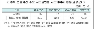 (조세금융신문=방영석 기자)추석 연휴 기간에 음주운전과 무면허 운전으로 인한 사고 피해자가 크게 증가, 안전운전의 필요성이 평상시 대비 높은 것으로 나타났다. 9일 보험개발원과 손해보험협회에 따르면 지난 3년간(2016∼2018년) 추석 연휴 기간 음주운전과 무면허 운전으로 인한 사상자는 각각 80명, 17명으로 평상시보다 30.9%, 62.3% 많았다. 중앙선 침범으로 인한 사상자도 평소보다 5.6% 많은 74명으로 집계됐다. 다만 신호 위반 사상자는 115명으로 7.9% 줄었다. 날짜별로 보면 교통사고는 귀성이 시작되는 추석 연휴 전날에, 부상자는 추석 당일에 특히 많았다. 추석 연휴 전날에는 하루 평균 4211건의 교통사고가 발생, 평소보다 36.6% 많았다. 부상자는 추석 연휴 전날에 5820명, 추석 당일에 7518명이 나왔다. 각각 평소보다 24.6%, 61.0% 많은 수치다. 추석 당일에는 성묘 등을 위해 친척 등이 차량에 동반 탑승하는 경우가 많아 사고가 났을 때 부상자 수가 더욱 늘어난 것으로 분석된다. 사고 유형을 나눠보면 자동차 추돌은 추석 연휴 중 연평균 1만2000건이 발생, 전체 사고에서 25.1%를 차지했다. 후진 사