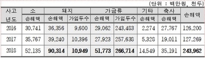 (조세금융신문=방영석 기자) 이례적인 무더위가 이어지면서 가축재해보험의 손해액이 급증하고 있는 것으로 나타났다. 6일 보험개발원에 따르면 2016∼2018년 가축재해보험 손해액은 각각 1260억원, 1270억원, 2440억원으로 매년 꾸준히 늘었다. 기록적인 폭염을 기록했던 지난해에는 폭염이 상대적으로 심하지 않았던 2017년과 비교했을 때 손해액이 91.7% 증가했다. 특히 사육 방식과 가축의 특성 때문에 폭염에 취약한 돼지와 가금류는 폐사가 늘면서 손해액이 각각 2.3배, 1.9배 늘었다. 지난해 손해율은 최근 3년중 가장 높은 150.6%였다. 돼지, 가금류의 손해율은 각각 223.6%과250.4%까지 올랐다. 돼지는 체내에서 발생한 대사열을 몸 밖으로 내보내는 능력이 부족하고, 가금류는 체온이 높고 깃털이 덮여있어 체온 조절이 어렵다. 또 대부분 공장식 밀집 축사에서 사육돼 기본 면역력이 약하고 스트레스에 취약해 기온이 올라가면 폐사로 이어지는 경우가 많다. 보험개발원은 "지구온난화로 여름철 폭염 일수가 증가하고 있고 가축 피해 역시 우려된다"며 "피해를 최소화하기 위해서는 양돈·양계 농가의 적절한 보험 가입과 축산환경 개선이 필요하다