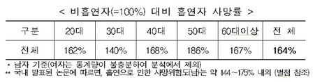 (조세금융신문=방영석 기자) 흡연자가 비협연자 대비 질병 발생률 및 사망률이 최대 1.6배 높은 것으로 나타났다. 31일 보험개발원이 제32회 세계 금연의 날을 맞아 발표한 분석 결과에 따르면 흡연자의 사망위험도는 164% 수준으로 비흡연자 대비 1.6배 높았다. 이는 2011년부터 2017년까지 생명보험사 정액보험과 실손의료보험의 계약 및 사고통계를 분석한 결과로 흡연자의 질병 입원률은 비흡연자 대비 1.5배, 수수률은 1.4배에 달했다. 남자 60세 기준 잔여 생존 기간은 18.7년으로 비흡연자와 비교해 7.9년 짧았다. 또한 비흡연자 대비 흡연자는 허헐성심질환과 심장질환, 간질환 부분에서 보험금 지급이 다수 발생하면서 흡연으로 인한 질환 발생 위험도가 높은 것으로 나타났다 강호 보험개발원장은 “흡연이 건강상태에 미치는 영향이 크고 상대 위험도의 뚜렷한 차이가 나타나고 있다”며 “금연에 대한 사회적인 인식 재정립이 필요하다”고 말했다.
