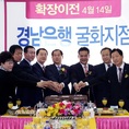 경남은행 김성돈 본부장(사진 오른쪽 세번째)과 굴화지점 이창우 지점장(사진 오른쪽 네번째) 등 굴화지점 이전식에 참석한 내외빈들이 축하떡을 자르고 있다.경남은행(은행장손교덕)은울산광역시남구삼호로79에소재하던삼호동지점을남구울밀로2906한솔애플타워1층으로확장이전하고영업점명을굴화지점으로변경했다.지난1991년10월개점해23년여간사용해오던영업점에서최신영업시설을갖춘신축건물로자리를옮겼다.확장이전한굴화지점은277.68㎡(약84평)규모의기업중심영업점으로탈바꿈했다.더불어최신인테리어와함께자동화코너·PB룸·고객상담실·대여금고등다양한편의시설을확충했다.근무인력은여신전문심사역(CMO)등여수신전문가7명이상주해금융서비스를제공한다.종전삼호동지점은기존고객들의이용편의를위해출장소로유지,4명의직원이종전대로금융서비스를제공할예정이다.이창우지점장은“23년여간지점을이용해준지역고객들에게좀더향상된서비스를제공하기위해확장이전을하게됐다.지점이전에따른기존고객들의번거로움을최소화함은물론새로운환경에걸맞은마음가짐으로한결같은금융서비스를제공하도록노력하겠다”며포부를밝혔다.한편14일오전진행된굴화지점이전식에는김성돈본부장을비롯해울산광역시남구의회이상문의원·한국은행울산본부오호일본부장·울산신용보증재단이찬우이사장등이많은내외빈이참석해확장이