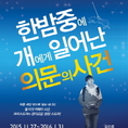 (조세금융신문=옥정수 기자) 내년 1월 31일까지 광림아트센터 BBCH홀에서 연극 한밤중에 개에게 일어난 의문의 사건 The Curious Incident of the Dog in the Night-Time이 공연된다.이 공연은 2013년 올리비에어워드와 2015년 토니어워드 연극 부문 최다 수상작으로 배우 김수로의 14번째 프로젝트 작품이다.연극은 자폐증을 앓고 있는 15세 소년 ‘크리스토퍼’가 이웃집 개가 살해당한 것을 발견하고 이 사건을 해결하기 위해 자신을 둘러싼 닫힌 세계를 벗어나 용감하게 세상 밖으로 발을 디디며 벌어지는 소년의 성장담을 다루고 있다.수학에 남다른 재능을 가진 열다섯 자폐아 소년 ‘크리스토퍼’ 역에는 배우 윤나무, 전성우, 려욱이 트리플 캐스팅됐으며, 지극 정성으로 아들을 돌보는 크리스토퍼 아버지 ‘에드’ 역에는 배우 김영호와 심형탁이 더블 캐스팅됐다.