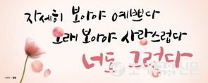 (조세금융신문=옥정수 기자) “자세히 보아야 예쁘다. 오래 보아야 사랑스럽다. 너도 그렇다.”교보생명은 지난달 4일부터 한달간 블로그(www.kyobolifeblog.co.kr)를 통해 ‘내 마음을 울리는 광화문글판은?’이라는 주제로 온라인 투표를 진행한 결과 2012년 봄편인 나태주 시인의 ‘풀꽃사진’의 문안이 가장 큰 지지를 받았다고 14일 밝혔다.다음으로 ‘사람이 온다는 건/ 실은 어마어마한 일이다/ 한 사람의 일생이 오기 때문이다’ (정현종 ‘방문객’, 2011년 여름편)가 시민들로부터 많은 선택을 받았다.장석주 시인의 ‘대추가 저절로 붉어질 리는 없다/ 저 안에 태풍 몇 개/ 천둥 몇 개, 벼락 몇 개’와 정호승 시인의 ‘먼 데서 바람 불어와/ 풍경 소리 들리면/ 보고 싶은 내 마음이/ 찾아간 줄 알아라’도 뒤를 이었다.교보생명은 투표에 참여한 2천300여명 가운데 100여명을 선정해 광화문글판 25주년 기념집, 교보문고 드림카드 등의 상품을 증정할 예정이다.