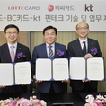 (조세금융신문=옥정수 기자) 롯데카드와 BC카드, KT가 서울 소공동 롯데호텔에서 핀테크업무 제휴 협약식을 가졌다고 22일 밝혔다. 이번 MOU(양해각서)를 통해 3사는 고객이 편리하고 안전하게 사용할 수 있는 모바일 결제 기술을 선도하고, O2O(온오프라인 연계)마케팅 제휴 플랫폼 구축 등을 협업할 예정이다.먼저 모바일 결제 기술 분야에서는 ▲KS 규격 원천 기술을 활용한 모바일 카드 결제 서비스 공동 추진 ▲NFC결제 신기술 관련 적기 시장 대응을 위해 HCE 기반 온오프라인 통합 결제 서비스 및 신규 스마트워치 단말기용 결제 서비스 협업 ▲FIDO 기반 생체인증 서비스 협업 등을 위해 롯데카드와 BC카드 간 다양한 제휴가 이루어질 전망이다. 아울러 지난 8월 KT가 출시한 스마트지갑 ‘클립(CLiP)’ 서비스에서 고객이 편리하게 이용할 수 있는 모바일 결제 서비스를 롯데카드와 BC카드가 공동 개발할 예정이다. 클립을 활용하여 상호 간에 보유한 그룹 차원의 가맹점 제휴 마케팅도 추진할 계획이다. BC카드 서준희 사장은 "이번 MOU가 카드사와 통신사간 협업을 통해 핀테크 시장을 선도하고자 체결된 만큼 3사가 가진 역량을 최대한 모아 고객들에게보다 보다 편