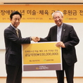 서울 종로구 KB국민카드 본사에서 열린 '장애 청소년 미술ㆍ체육 활동 후원식' 후 김덕수 KB국민카드 사장(왼쪽)이 정형석 밀알복지재단 대표에게 후원금 1억원을 전달하고 있다.(조세금융신문=옥정수 기자)KB국민카드(사장김덕수)는서울종로구KB국민카드본사에서‘장애청소년미술·체육활동후원식’을갖고후원금1억원을전달했다고22일밝혔다.이날전달된후원금은전국장애인종합복지관,대한장애인체육회등의협조를통해선정된미술분야17명,체육분야10명등총27명의장애청소년을 위해사용된다.미술분야의경우내년3월까지전문강사진의지도하에장애청소년들에게최적화된교육프로그