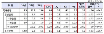 (조세금융신문=이기욱 기자)자회사 투자지분 손실 등 일시적 요인들로 인해 은행권의 총 순익이 이자이익 증가에도 불구하고 크게 감소한 것으로 확인됐다. 14일 금융감독원이 발표한 자료에 따르면 국내 은행권은 지난 1분기 총 3조8000억원의 당기순이익을 기록했다. 이는 지난해 동기(4조4000억원) 대비 14.2%나 줄어든 수치다. 순익 감소에 가장 큰 영향을 미친 것은 자회사 등 투자지분 관련 손실이다. 지난해 3000억원 흑자를 보인 투자지분 관련 손익은 올해 1분기 2000억원 적자로 돌아섰다. 명예퇴직 관련 급여 집행 등으로 인건비도 3000억원 증가했다. 다만 은행권의 핵신 수입원인 이자이익은 여전히 견실한 모습을 보여주고 있다. 1분기 국내은행의 총 이자이익은 10조1000억원으로 지난해(9조7000억원)보다 0.4% 늘어났다. 지난해 2분기 이후 4분기째 10조원대를 기록하고 있다. 예대금리차 축소의 영향으로 순이자마진(NIM)은 1.65%에서 1.62%로 0.03%p 악화된 반면 대출채권 등 운용자산은 6.4% 늘어났다. 비이자이익은 1조7000억원으로 지난해와 비슷한 수준을 유지했다. 금리하락에 따른 채권매매·평가이익으로 유가증권관련