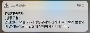 (조세금융신문=이유리나 기자) 서울 성동구에 시간 당 엄청난 양의 폭우가 쏟아지면서 산사태 주의보가 발령됐다. 10일 기상청에 따르면 이날 오후 기습적인 폭우가 쏟아졌다. 폭우는 시간당 40미리미터가 넘는 양. 특히 용산구 등 중북부 지역에 50미리미터가 넘는 많은 양의 비가 한꺼번에 쏟아졌다. 이와 더불어 성동구는 이날 늦은 밤 많은 양의 비가 내려 지반이 상대적으로 약할 것을 대비해 산사태 주의보를 발령했다. 성동구는 이날 “주의보가 발령돼 알려드린다”며 “안전에 유의하기 바란다”고 밝혔다.
