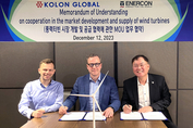 (조세금융신문=이정욱 기자) 코오롱글로벌이 지난 12일 과천 코오롱 타워에서 독일의 기어리스 직접구동형 풍력 터빈의 선도업체 '에너콘'과 업무협약을 체결했다고 13일 밝혔다. 에너콘은 베스타스, 지멘스가메사와 함께 글로벌 풍력 3대 선도기업으로 꼽힌다. 양사는 이번 업무협약을 통해 국내 육해상 풍력사업개발정보 및 기술력, 개발경험, 노하우를 공유해 지속적인 협력을 통해 시너지를 극대화한다는 방침이다. 이에 앞서 코오롱글로벌은 2018년 베스타스(태백 가덕산 1단계), 2022년 에너콘(영덕 호지마을), 2023년 지멘스가메사(평창횡계)와 공급계약을 체결하면서 글로벌 풍력 메이저 3사와의 파트너십을 공고히 이어오고 있다. 현재 코오롱글로벌이 상업운전중인 풍력단지는 경주풍력 1, 2단계(37.5㎿), 태백가덕산 1단계(43.2㎿), 태백가덕산 2단계(21㎿)다. 양양 만월산 1단계(42㎿), 양양 만월산 2단계(4.2㎿), 영덕 해맞이(34.4㎿), 영덕 호지마을(16.68㎿), 평창 횡계(26㎿)는 공사가 진행중이며, 태백 하사미 풍력(17.6㎿)도 착공을 앞두고 있다. 코오롱글로벌은 양산 리파워링 등 총 9건의 육상풍력사업을 개발하고 있다. 내년에는 6건의