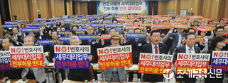 (조세금융신문=이지한 기자)한국세무사회(회장 원경희)는 18일 서초동 ‘더 바인’에서 전국 지역세무사회장 간담회를 개최하고 변호사에게 세무대리업무 전부 허용하는 세무사법 개정안에 반대하는 결의를 다졌다. 이날 지역회장 간담회에는 7개 지방세무사회장과 100 여명의 지역세무사회 회장들이 참석해, 지난 8월 26일 기획재정부가 입법예고한 변호사에게 세무대리업무 전부를 허용하는 세무사법 개정안의 부당성에 대해 성토하고 이를 결사 반대하는 결의대회를 가졌다. 먼저 원경희 회장은 지역회장들에게 세무사법 개정안에 대한 경과보고, 국민청원 동의 및 개정안 반대 결의에 대해 설명했다. 원 회장은 “지금 1만3천 회원 모두가 변호사에게 세무대리업무를 전부 허용하는 정부의 세무사법 개정안을 강력하게 반대한다”며 “우리 모두 일치단결하여 이것을 반드시 막아내야 하며 막아낼 것이다”고 강조했다. 이어 “우리는 변호사에게 기장대리와 성실신고확인업무를 내어 주지 않는 세무사법으로 개정하기 위한 노력을 할 것이다”면서 “회원 모두가 단합하여 함께하면 이룰 수 있는 만큼 지역회장님들께서 앞장서고 도와주기 바란다”고 말했다. 그러면서, “우리가 원하는대로 세무사법이 개정될 수 있