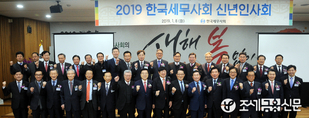 (조세금융신문=이지한 기자) 한국세무사회 신년인사회가 8일 오전 11시 한국세무사회관 6층 대강당에서 열려 임원과 회원 등 500여명이 참석한 가운데 성황리에 진행됐다. 정동원 총무이사의 사회로 진행된 이 날 신년인사회에는 영상으로 인사한 문희상 국회의장을 비롯해 민주평화당 박지원 의원, 더불어민주당 김진표 의원, 우원식 의원, 유승희 의원, 서영교 의원, 자유한국당 김광림 의원, 이종구 의원 등이 참석해 자리를 빛냈다. 또 국회의원과 한국세무사회장을 역임한 김종구, 양창영, 윤영선, 김종열, 나오연, 신상식, 구종태, 임향순, 정구정 고문과 조세금융신문 김종상 대표, 조세일보 황춘섭 대표와 한국세무사회와 지방세무사회 임원 등이 참석해 자리를 빛냈다. 이창규 한국세무사회장은 신년사를 통해 “‘기본과 원칙’을 지키며, 강하고 힘 있는 한국세무사회를 만들어가겠다”라고 밝혔다. 이 회장은 “지난 2018년은 미·중 무역 전쟁을 시작으로 촉발된 세계 경제 불황의 여파는 우리나라 경제에도 큰 영향을 미쳐 총체적 불경기를 가져왔으며, 특히 최저임금인상과 주 52시간 근로시간 단축은 세무사 업계에도 직격탄이 되어 많은 어려움을 겪었던 한해였다”라고 소감을 밝히