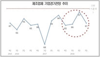 (조세금융신문=이한별 기자)상승세였던 제조업체 체감경기전망이 3분기 다시 가라앉았다. 화장품·제약 등 경박단소(輕薄短小) 업종의 전망은 밝았지만 자동차·철강 등 중후장대(重厚長大) 업종의 전망은 어두웠다는 분석이다. 대한상공회의소는 최근 2200여개 제조업체를 대상으로 실시한 ‘3분기 제조업체 경기전망지수(BSI) 조사’ 결과 전망치는 87로 지난 2분기 97에서 10포인트 내려앉았다고 밝혔다. BSI는 작년 4분기 85, 올 1분기 86으로 상승흐름을 보여왔다. 대한상의는 중후장대 산업의 부정적 전망이 경박단소 업종의 긍정적 전망을 넘어섰다고 분석했다. 실제 ‘조선(67)’은 2년 전 수주절벽에 따른 실적부진, ‘자동차․부품(75)’은 미국의 관세인상 움직임, ‘정유․유화(82)’는 이란 쇼크 등 유가급등 움직임, ‘철강(84)’은 미국의 관세인상과 자동차 등 수요산업 불황으로 기준치를 밑돌았다. 반면 미국과 EU(유럽연합) 그리고 인도, 중화권에서 유행을 타고 있는 K-뷰티(beauty)와 K-의료(Medical) 덕분에 ‘화장품(127)’, ‘제약(110)’, ‘의료정밀기기(102)’ 등은 기준치를 웃돌았다. BSI는 100이상이면 ‘이번 분기