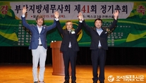 (조세금융신문=전한성 기자) 제29대 한국세무사회장선거 투표가 동시에 진행될 '부산지방세무사회 제41회 정기총회'가 25일 오전부산 해운대구 우1동 벡스코에서 열린 가운데단독 입후보로 연임에 성공한 최상곤(가운데) 회장이 박재우(왼쪽), 신현동 부회장과 기념촬영을 하고 있다.