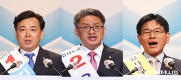 (조세금융신문=전한성 기자) '제22회서울지방세무사회 정기총회'가 18일 오후 서울 여의도 한화63시티에서 열린 가운데 제29대 세무사회장선거 감사후보자들이 연설을 하고 있다.왼쪽부터 기호 1번 김형상 후보, 기호 2번 유영조 후보, 기호 3번 백정현 후보.