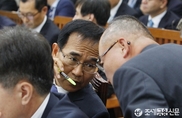 (조세금융신문=전한성 기자) 제334회 국회(임시회) 제1차 기획재정위원회 전체회의가 15일 오전에 열린 가운데 최경환(오른쪽) 경제부총리 겸 기획재정부 장관이 방문규 제2차관과 귀엣말을 나누고 있다.오늘 전체회의에선 기획재정부와 국세청의 2014회계연도 예비비지출 승인의 건과 기획재정부, 국세청, 관세청, 조달청, 통계청의 업무보고, 공공기관 경영평가 및 정상화 추진대책에 대한 보고가 이어졌다.