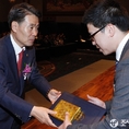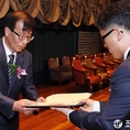 (조세금융신문=전한성 기자) 제29대 한국세무사회장선거 투표가 동시에 진행될 '대구지방세무사회 제41회 정기총회'가 23일 오전 대구 수성구 만촌동 인터불고 호텔에서 열린 가운데최성탁 대구지방세무사회장이 단독 입후보로 무투표 당선에 성공한 후 선관위로부터 당선증을 수여받고 있다.