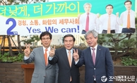 (조세금융신문=전한성 기자) 제29대 한국세무사회장 선거에 나선 기호 2번조용근 후보의 선거사무소 개소식이 8일 오후에 열린 가운데 조(가운데) 후보와 러닝메이트신광순(왼쪽), 안수남부회장 후보가 기념촬영을 하고 있다.