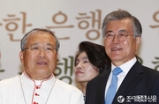 (조세금융신문=전한성 기자) 장발장은행(은행장 홍세화) 설명회인 '국회로 간 장발장'이 4일 오후 서울 여의도 국회 의원회관에서 열린 가운데 염수정(왼쪽) 추기경이 새정치민주연합 문재인 대표와 기념촬영을 하고 있다.이번 설명회는4만 명이 넘는 가난한 시민들이 단지 벌금을 내지 못해 교도소에 가는 안타까운 현실을 전하고, 이를 개선하기 위한 벌금제 개혁 법안의 필요성을 국회의원과 시민들에게 설명하기 위해 마련했다. 장발장은행은 벌금형을 선고 받고도 이를 낼 돈이 없어 교도소에 갇히는 이들을 위해 무담보, 무이자 대출을 진행하고 있으며, 시민 모금으로 운영되는 장발장은행은 지금까지 981명의 개인 및 기관, 단체에서 3억2232만641원을 모금했고, 9차에 걸쳐 총 155명에게 2억8608만8400원을 대출했다고 전했다.