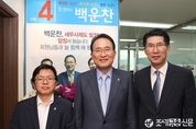 (조세금융신문=전한성 기자) 제29대 한국세무사회장 선거에 나선 기호 4번 백운찬 후보의 선거사무소 개소식이 5일 오후에 열린 가운데 백 후보가 관세청 노석환(왼쪽) 조사감시국장, 관세청 김광호(오른쪽) 정보협력국장과 기념촬영을 하고 있다.