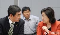 (조세금융신문=전한성 기자) 국회 론스타 긴급토론회 '5조원 세금 걸린 ISD로 다시 보는 론스타 문제 - 대한민국은 론스타에게 언제까지 퍼줄 것인가?'가 22일 오후 서울 여의도 국회 의원회관에서 열린 가운데 새정치민주연합 이종걸(왼쪽) 원내대표와 정의당 심상정 원내대표가 대화 나누고 있다.