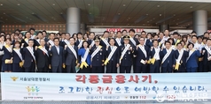 (조세금융신문=전한성 기자) 금융감독원과 경찰청, 금융권이 합동으로금융사기 예방을 위해 22일 전국 각지에서 경찰관과 금감원 및 금융회사 직원 등 1만여 명이 참여하는 가두 캠페인을 실시한 가운데 서울역 앞 행사 관계자들이 기념촬영을 하고 있다.참여자는 금감원 소속이 200여 명, 경찰청 소속은 3700여 명, 금융권에서는 6100여 명이 참여했다.이들은 전국 일선 경찰서가 있는 전철역과 재래시장 등 유동인구 밀집지역 216곳에서 '대포통장 근절 및 금융사기 척결' 가두 캠페인을 실시하고 홍보리플릿 등을 배포하며 경로당과 노인복지관 등에 보이스피싱 피해 예방 홍보 포스터를 부착해 금융사기 피해예방 의식을 고취하고 피해예방 상담 등을 실시할 계획이다.