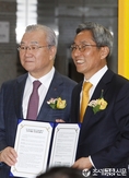 (조세금융신문=전한성 기자) '2015 KB 굿잡 우수기업 취업박람회'가 13일 오전 서울 강남구 삼성동 코엑스에서 개막한 가운데 행사 전 한국무역협회와 국민은행이 양해각서 체결식을 갖고 김인호(왼쪽, 한국무역협회) 회장과 윤종규 회장이 기념촬영을 하고 있다.