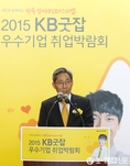 (조세금융신문=전한성 기자) '2015 KB 굿잡 우수기업 취업박람회'가 13일 오전 서울 강남구 삼성동 코엑스에서 개막한 가운데 윤종규 KB금융지주 회장 겸 KB국민은행장이 인사말을 하고 있다.이번 취업박람회는 KB국민은행이 중견·중소기업의 인력난 해소와 청년 일자리 창출에 기여하기 위해 지난 2011년부터 시작했고 이력서 작성부터 면접, 채용에 이르기까지 모든 것이 한자리에서 진행되며 14일까지 코엑스 D홀에서 열린다.