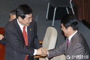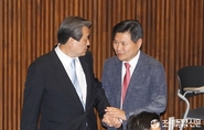 (조세금융신문=전한성 기자) 소득세법 일부개정법률안을 다룰 제333회 국회(임시회) 제1차 본회의가 12일 오후 개의된 가운데 새누리당 김무성(왼쪽) 대표가 홍문종 의원과 악수 나누고 있다.