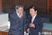 (조세금융신문=전한성 기자) 소득세법 일부개정법률안을 다룰 제333회 국회(임시회) 제1차 본회의가 12일 오후 개의된 가운데 새정치민주연합 문재인(왼쪽) 대표가 박병석 의원과 대화 나누고 있다.