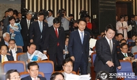 (조세금융신문=전한성 기자) 새정치민주연합의 새로운 원내대표를 선출하는 '제60차 의원총회 - 제19대 국회 제4기 새정치민주연합 원내대표 선거'가 7일 오후 서울 여의도 국회에서 열린 가운데 원내대표 후보자들이 나란히 입장하고 있다. 맨 앞부터 최재성, 조정식, 이종걸, 설훈, 김동철 후보.