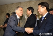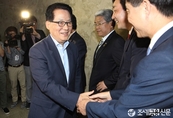 (조세금융신문=전한성 기자) 새정치민주연합의 새로운 원내대표를 선출하는 '제60차 의원총회 - 제19대 국회 제4기 새정치민주연합 원내대표 선거'가 7일 오후 서울 여의도 국회에서 열린 가운데 박지원(왼쪽)의원이후보자들과 악수 나누고 있다.