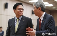 (조세금융신문=전한성 기자) 글로벌금융학회와 한국금융연구원이 공동으로 주최하는 '정책심포지엄 - 창조경제활성화를 위한 금융제도 개혁'이 8일 오전 서울 중구 명동 은행회관 국제회의실에서 열린 가운데 정우택(왼쪽) 국회 정무위원회 위원장이 임종룡 금융위원장과 대화 나누고 있다.