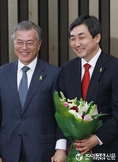 (조세금융신문=전한성 기자) 7일 오후 서울 여의도 국회에서 열린'제60차 의원총회 - 제19대 국회 제4기 새정치민주연합 원내대표 선거'에서 4선의 이종걸 의원이 결선 투표 끝에 최재성 후보를 누르고 신임 원내대표로 선출된 가운데 문재인 대표와 기념촬영을 하고 있다.