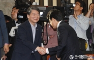 (조세금융신문=전한성 기자) 새정치민주연합의 새로운 원내대표를 선출하는 '제60차 의원총회 - 제19대 국회 제4기 새정치민주연합 원내대표 선거'가 7일 오후 서울 여의도 국회에서 열린 가운데 문재인(왼쪽) 대표가 조정식 후보와 악수 나누고 있다.