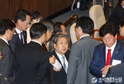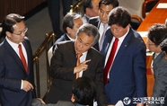 (조세금융신문=전한성 기자) 6일 오후제332회국회(임시회) 제9차 본회의가 한 시간 지연끝에 개의된 가운데 새누리당 유승민 원내대표 자리에 여당 의원들이 모여 박상옥 대법관 임명동의안 처리에 필요한 정족수 확보를 위해 분주하게 움직이고 있다.