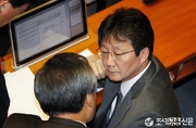 (조세금융신문=전한성 기자) 오후4시에 개의될 예정이었던 제332회국회(임시회) 제9차 본회의가 현재 야당 의원들의 불참속에 개의되지 못하고 있는 가운데 새정치민주연합 우윤근 원내대표가 새누리당 유승민 원내대표를 찾아 긴밀한 대화를 나누고 있다.