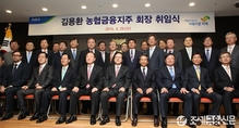 (조세금융신문=전한성 기자) 김용환 신임 NH농협금융지주 회장의 취임식이 29일 오전 서울 중구 농협 본관 중회의실에서 열린 가운데 김 회장(앞줄 오른쪽에서 다섯번째)이 계열사 임직원들과 기념촬영을 하고 있다.김용환 회장은 이날 취임식에서 튼튼한 건정성 토대 위에서 외형에 걸맞는 내실있는 수익성 확보라는 농협금융 본연의 역활에 충실하고, 농협중앙회 및 농협경제와 상호협력을 통한 시너지 창출, 직원 전문성 교육 강화, 해외진출을 통한 신사업 발굴 육성, 농업인·서민금융 지원 및 소비자보호 강화 등 사회적 책임을 다하는 농협금융의 공익적 가치를 더욱 높여 나가겠다는 계획을 밝혔다.또한, 이날 아침 취임식전 노동조합 사무실을 가장 먼저 방문하여 직원들과의 적극적인 소통으로 생생한 현장의 목소리를 청취하고, 농협금융이 직면한 현안들을 슬기롭게 해결해 나가겠다고 밝혔다.